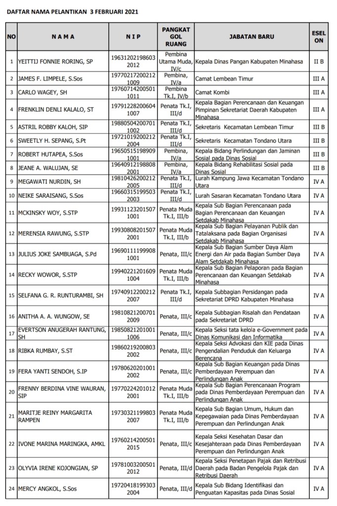 Yeittij Fonnie Roring yang menjabat Staf Ahli dilantik sebagai Kepala Dinas Pangan, Camat Kombi yang ditinggalkan Deydy Tumarar yang memasuki purna bakti di tempati oleh Carlo Wagey dan Camat Lembean Timur dijabat oleh James Limpele yang sebelumnya menjabat Sekretaris Kecamatan Lembean Timur. Total pejabat yang dilantik sebanyak 60 Pejabat.