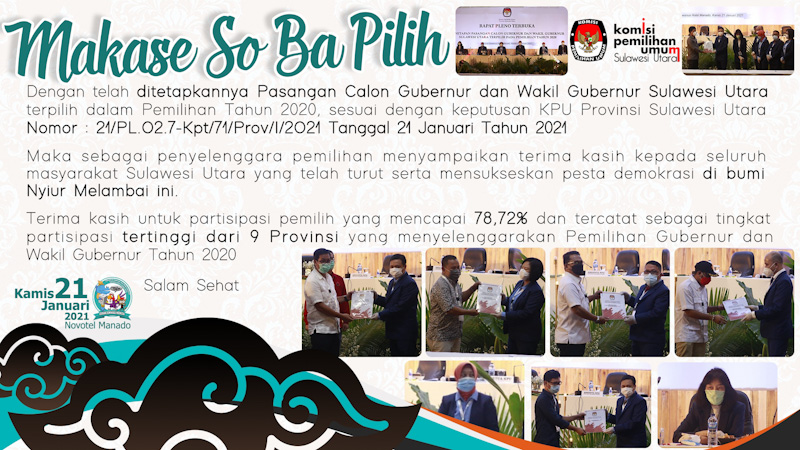 Maka sebagai penyelenggara pemilihan menyampaikan terima kasih kepada seluruh masyarakat Sulut yang sudah turut serta mensukseskan pesta demokrasi di bumi Nyiur Melambai ini.