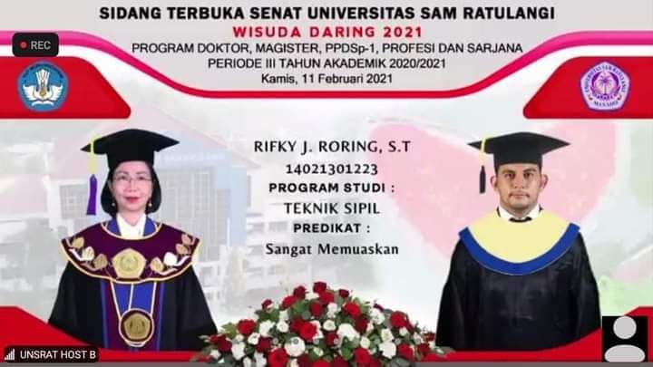 Minahasa – Bupati Minahasa Dr Ir Royke Octavian Roring MSi, bersama isteri tercinta Ketua TP-PKK Kabupaten Minahasa Dra Fenny Ch M Roring-Lumanauw, bersyukur dan berbangga karena anak laki-laki mereka, Rifky Johanes Roring, boleh menyelesaikan studi Sarjana (S1) dan diwisuda di Universitas Sam Ratulangi (Unsrat) Manado, Kamis (11/02) pagi.