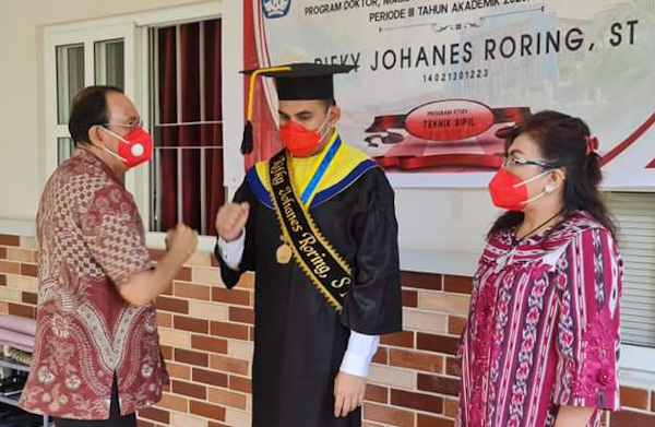 “Sebagai orang tua, kami merasa bersyukur kepada Tuhan dan bangga karena anak kami ini boleh menyelesaikan studinya di perguruan tinggi Unsrat Manado, dan boleh menyandang gelar Sarjana Teknik,” kata Bupati didampingi isteri tercinta.