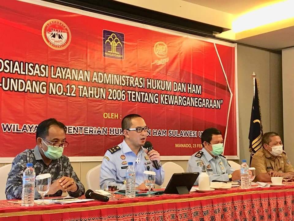 SULUTNEWSTV.com, Manado – Kementerian Hukum dan Ham Wilayah Sulawesi Utara menggelar Sosialisasi tentang Layanan Administrasi Hukum dan Ham Undang-undang no 12 Tahun 2006 tentang kewarganegaraan, Selasa 23/2 di Hotel Ibis Manado.