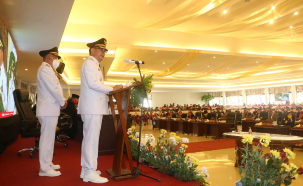 “Pada kesempatan yang berbahagia ini juga, kita semua boleh hadir di tempat ini dalam rangka mengikuti rapat paripurna DPRD Kota Tomohon dalam rangka serah terima jabatan dan mendengarkan pidato / sambutan Walikota Kota Tomohon periode 2021 – 2024,” ujarnya.