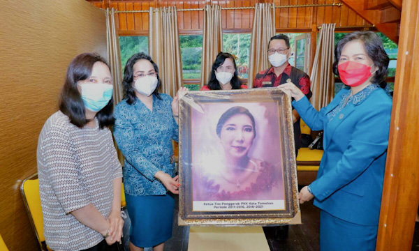 ” Ijinkan kami untuk menyerahkan hadiah berupa bingkian dan cindera mata, karena telah mengabdi sebagai Ketua tim penggerak PKK, jangan di lihat dari bentuknya tapi Deng ketulusan kami memberi cindera mata ini. Terima kasih sudah mengabdi untuk Kota Tomohon” ucap Karundeng.