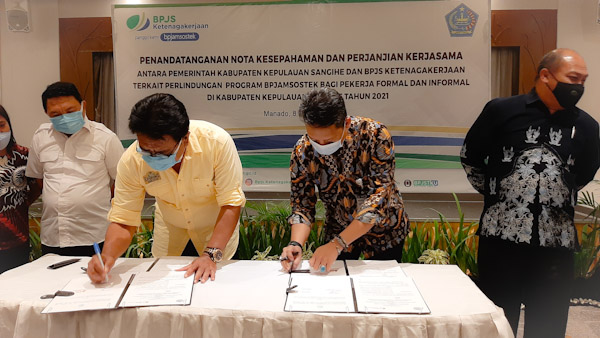 Hal tersebut, ditandai dengan dilakukannya MoU antara BPJamsostek Cabang Manado bersama dengan Pemerintah Kabupaten Sangihe dalam acara penandatanganan Nota Kesepahaman dan Perjanjian Kerjasama antara Pemerintah Kabupaten Kepulauan Sangihe dan BPJS Ketenagakerjaan terkait perlindungan program BPJamsostek bagi pekerja formal dan informal di Kabupaten Kepulauan Sangihe tahun 2021, di Hotel Four Point Manado, Senin(8/3).
