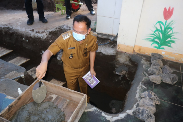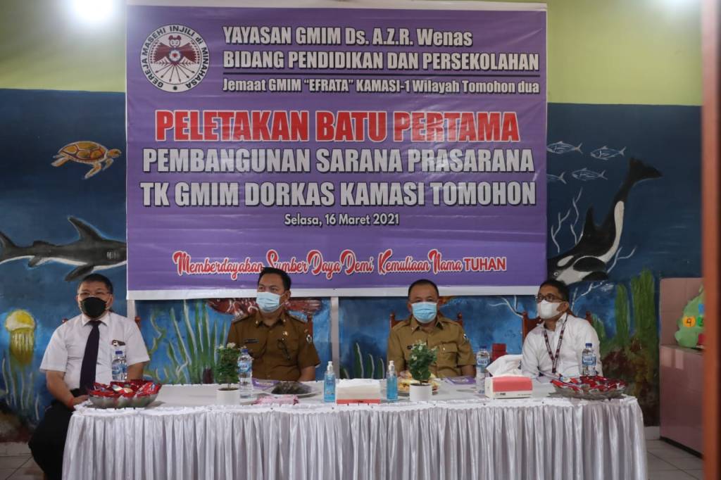 SULUTNEWSTV.COM, – Walikota Tomohon Caroll J A Senduk SH melakukan peletakan batu pertama pembangunan sarana prasarana Taman Kanak Kanak GMIM Dorkas Kamasi Kecamatan Tomohon Tengah Selasa (16/3/21).