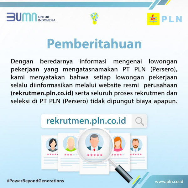 Isi pengumuman menyatakan ‘Pemberitahuan : Dengan Beredarnya Informasi Mengenai Lowongan Pekerjaan Yang Mengatasnamakan PT PLN (Persero), Kami Menyatakan Bahwa Setiap Lowongan Pekerjaan Selalu Diinformasikan Melalui Website Resmi Perusahaan (rekrutmen.pln.co.id), Serta Seluruh Proses Rekrutmen Dan Seleksi di PT PLN (Persero) Tidak Dipungut Biaya Apapun’.