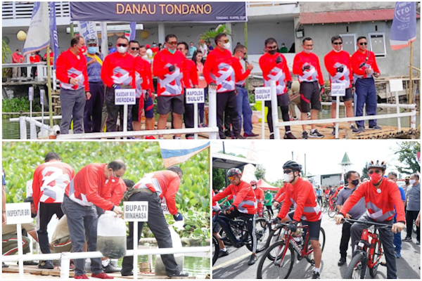 SULUTNEWSTV.com, MINAHASA – Bupati Minahasa DR Ir Royke Octavian Roring M.Si mendampingi Gubernur Sulawesi Utara Olly Dondokambey SE, Mengikuti Kegiatan Fun Bike Sekaligus melepas 55 ribu bibit Ikan Air Tawar di Danau Tondano, Sabtu(10/4), yang di gelar oleh Bank BRI bersama Forkopimda Sulut