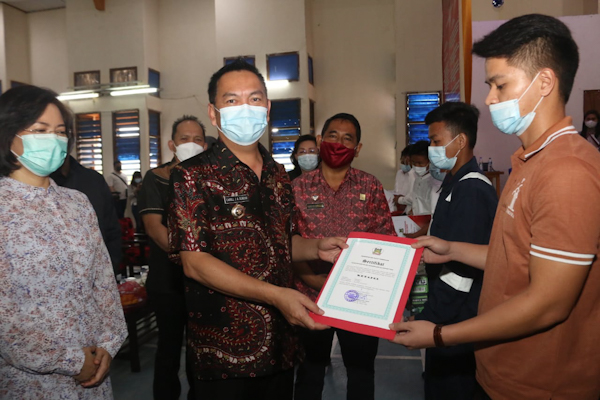 SULUTNEWSTV.COM, TOMOHON – Walikota Tomohon Caroll Joram Azarias Senduk, S.H. didampingi Ketua Tim Penggerak PKK Kota Tomohon drg. Jeand’arc Karundeng menyerahkan ijazah paket C dan B warga binaan yang telah menyelesaikan pendidikan paket B dan C di Lembaga Pembinaan Khusus Anak Kelas II Tomohon, Jumat (30/4/21).