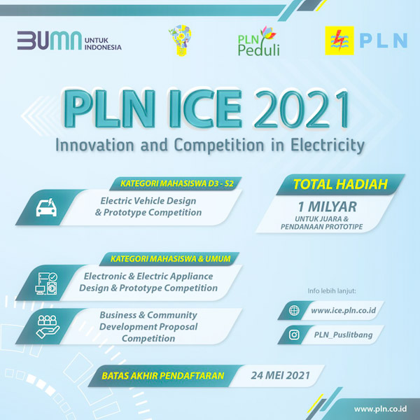 Bertajuk PLN ICE 2021 (Innovation & Competition in Electricity), terdapat 2 (dua) kategori yang di kompetisikan, yaitu Kendaraan Listrik dan Non Kendaraan Listrik. Untuk kategori kendaraan listrik terdapat 4 (empat) sub kategori yaitu sub kategori mobil listrik, sub kategori motor listrik, sub kategori sepeda listrik dan sub kategori kendaraan listrik roda tiga.
