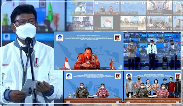 Tondano – Bupati Minahasa Dr Ir Royke Octavian Roring MSi mengikuti kegiatan Penandatanganan Nota Kesepakatan Implementasi Kota Cerdas (Smart City) tahun 2021 bagi 48 Kabupaten/Kota di Kawasan Pariwisata Prioritas Nasional dan Kawasan Ibu Kota Negara Baru yang dipilih dan ditetapkan oleh Kementerian Komunikasi dan Informatika RI, pada Kamis, 20 Maret 2021 siang secara virtual.