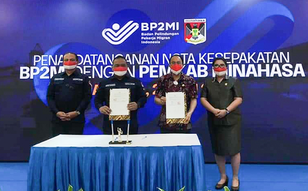 Minahasa – Pemerintah Kabupaten (Pemkab) Minahasa dengan Badan Perlindungan Pekerja Migran Indonesia (BP2MI) menandatangani Perjanjian Kerjasama dan Nota Kesepakatan mengenai dukungan terhadap penempatan dan perlindungan Pekerja Migran Indonesia (PMI). Penandatanganan PKS dan Nota Kesepakatan tersebut merupakan implementasi dari amanat Undang-undang Nomor 18 Tahun 2017 tentang Perlindungan Pekerja Migran Indonesia khususnya Pasal 41.