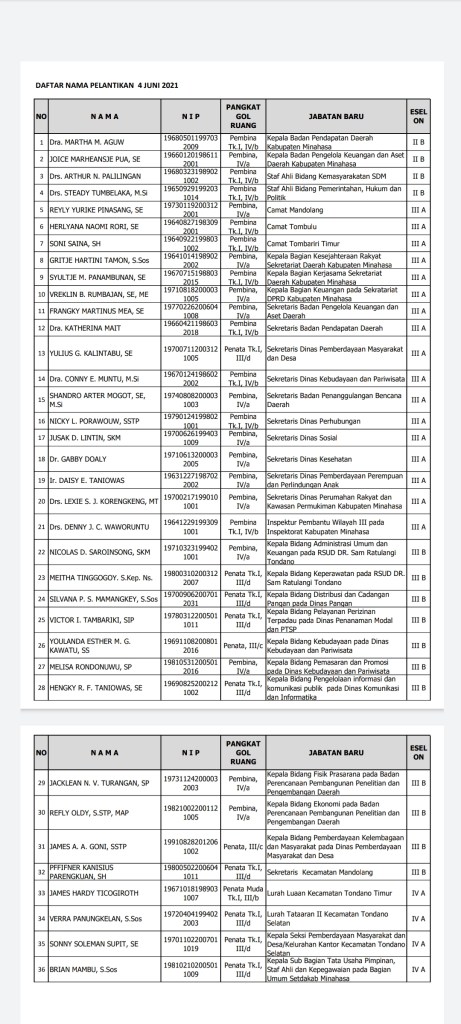 Dengan melaksanakan protokol kesehatan, Pelantikan ini didahului debgan pembacaan Surat Keputusan Bupati Minahasa tentang Pengangkatan dan Pemindahan Aparatur Sipil Negara dalam Jabatan Pimpinan Tinggi Pratama, Administrator dan Pengawas, oleh Kepala Badan Kepegawaian Dan Pengembangan SDM Minahasa Drs. Moudy Pangerapan, MAP.