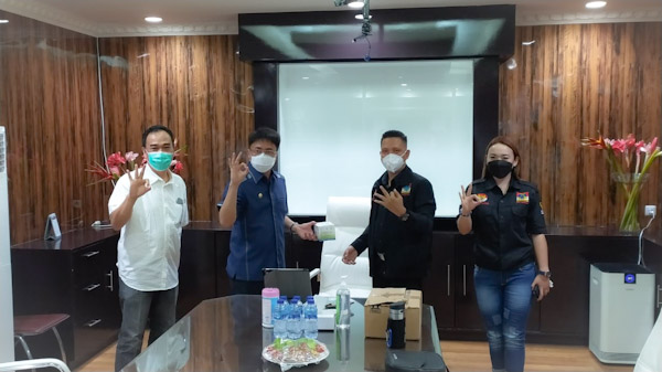 Bantuan diterima langsung Walikota Manado Andrei Angouw didampingi Kepala Dinas Komunikasi dan Informasi, Erwin Kontu serta Ketua Media Center AARS Steven Rondonuwu diruang kerja Walikota Manado.