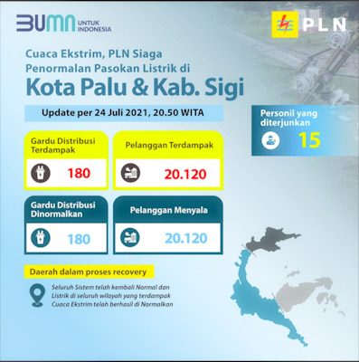 “Terpantau pada Sabtu (24/07) malam pukul 19.25 WITA sistem kelistrikan mengalami gangguan akibat cuaca ekstrim yang mengakibatkan terjadinya penghentian pasokan tenaga listrik sementara dengan total gardu distribusi terdampak 180 unit dan untuk pelanggan yang terdampak sekitar 20.120 pelanggan,” ujar Manager PLN UP3 Palu Muhammad Wardi Hadi.