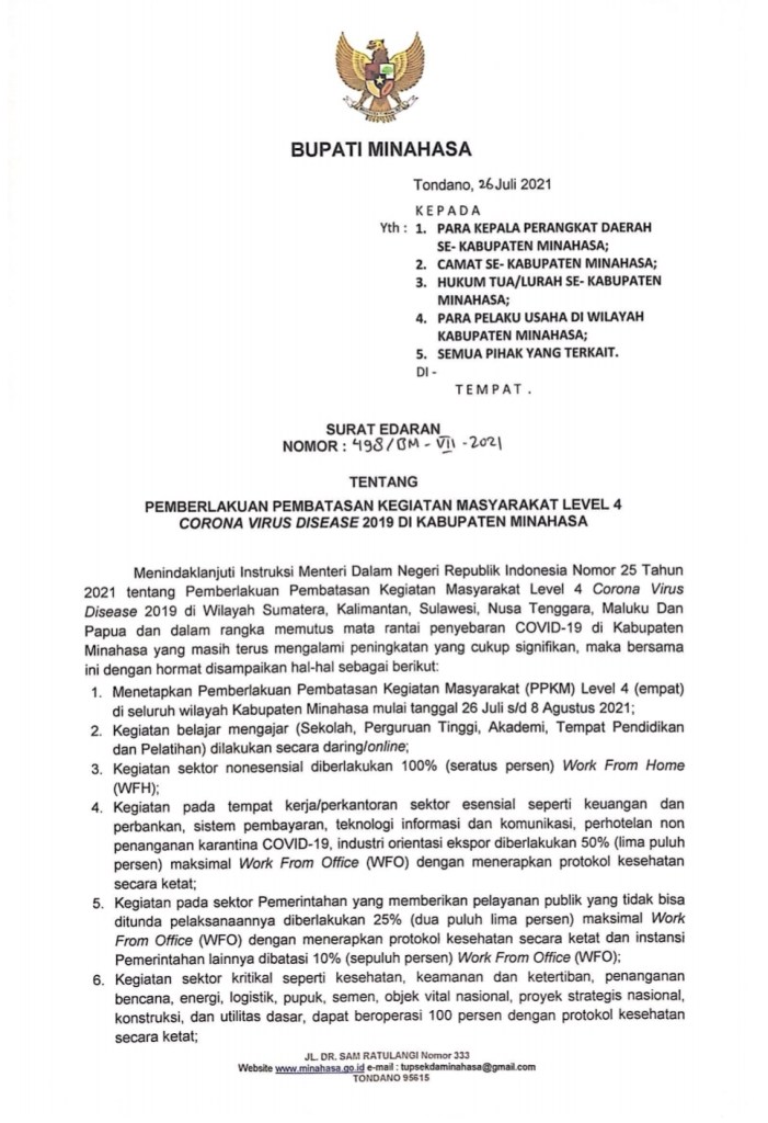 Tondano – Menindaklanjuti instruksi Menteri Dalam Negeri Republik Indonesia Nomor 25 Tahun 2021 tentang Pemberlakuan Pembatasan Kegiatan Masyarakat Level 4, Pemkab Minahasa dibawah kepemimpinan Bupati Royke Roring dan Wakil Bupati Robby Dondokambey dalam rangka memutus mata rantai penyebaran Covid-19 yang terus terjadi peningkatan yang cukup signifikan mengeluarkan Surat Edaran.