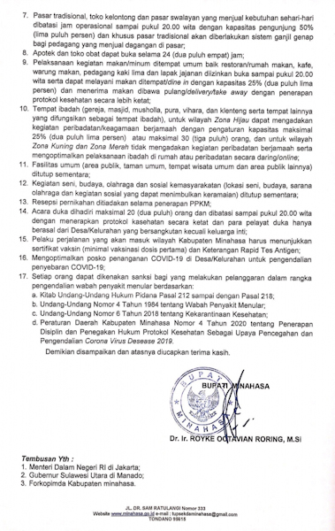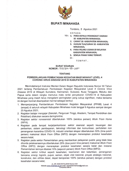 Menindaklanjuti instruksi Menteri Dalam Negeri Republik Indonesia Nomor 30 Tahun 2021 tentang Pemberlakuan Pembatasan Kegiatan Masyarakat Level 4, Pemkab Minahasa dibawah kepemimpinan Bupati Royke Roring dan Wakil Bupati Robby Dondokambey dalam rangka memutus mata rantai penyebaran Covid-19 yang terus terjadi peningkatan yang cukup signifikan mengeluarkan Surat Edaran.