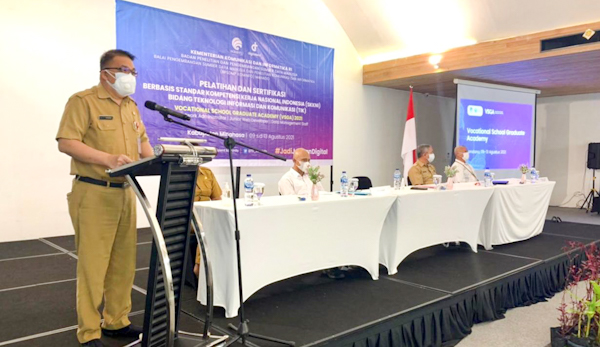Tondano – Bupati Minahasa Dr Ir Royke Octavian Roring MSi diwakili oleh Kepala Dinas Komunikasi dan Informatika Kabupaten Minahasa Agustivo Tumundo SE MSi membuka secara resmi pelaksanaan Pelatihan dan Sertifikasi Berbasis Standar Kopentensi Kerja Nasional Indonesia (SKKNI) Bidang Teknologi Informasi Komunikasi Vocational School Graduate Academy 2021 yang digelar oleh Balai Pengembangan SDM dan Penelitian (BPSDMP) Kominfo Manado pada Senin, 9 Agustus 2021 di Hotel Yama Resor Tondano.
