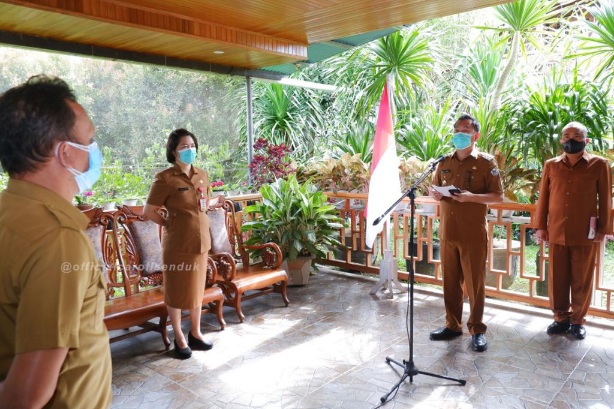 Tomohon – Dalam menjalankan tugas sebagai pimpinan daerah Kota Tomohon, Wali Kota Tomohon Caroll Senduk SH didampingi Kerua TP PKK Kota Tomohon Ny. Drg. Jeand’arc Senduk Karundeng, memimpin apel kerja Jajaran Pemerintah Kota Tomohon yang dilaksanakan secara virtual dari kediaman Wali Kota, Senin (6/9/21).