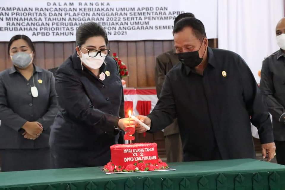 Disela-sela Rapat Paripurna ini, segenap Anggota DPRD Minahasa merayakan dua tahun menjabat sebagai Wakil Rakyat, yang ditandai dengan pemasangan lilin HUT oleh Wabup RD dan Ketua DPRD Glady Kandouw. *Advertorial. (CT)
