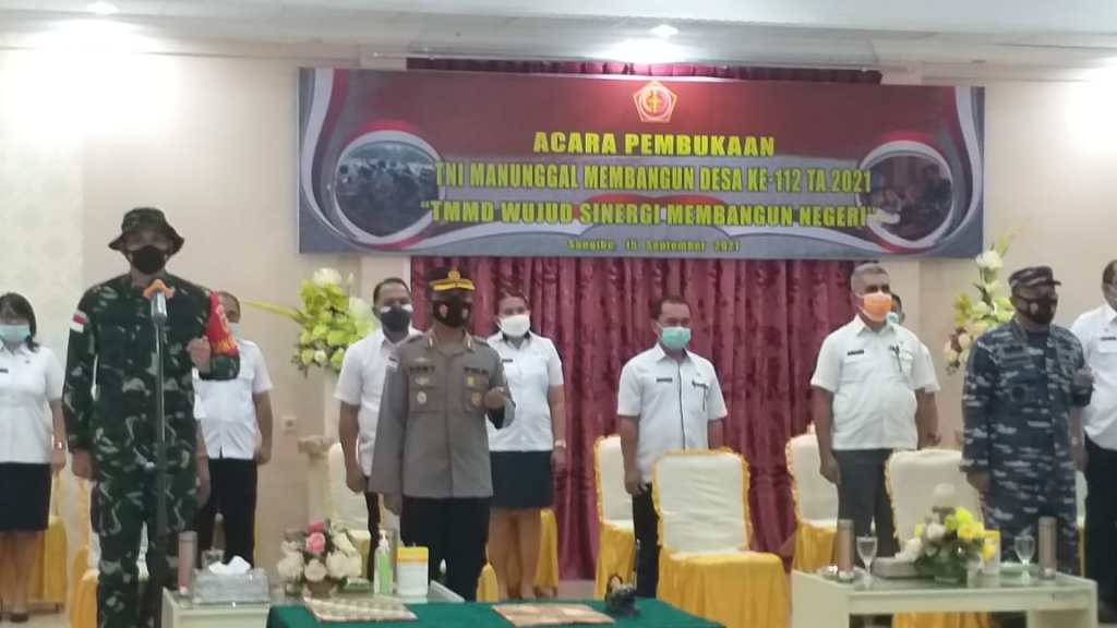 SULUTNEWSTV.com, TAHUNA – Tentara Manunggal Membangun Desa (TMMD) Ke-112 TA 2021 yang digelar di wilayah Kodim 1301/Sangihe secara resmi dibuka di aula pendopo Jabatan Bupati Kabupaten Kepulauan Sangihe di Jalan Merdeka, Kecamatan Tahuna, Rabu (15/9).