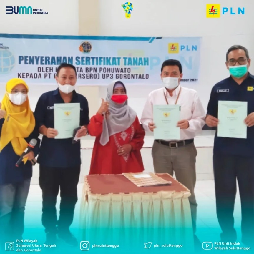 Kepala Kantor BPN Pohuwato, Lindaryam Jahja meyerahkan secara langsung sertifikat tanah secara simbolis kepada Supriyadi selaku Manajer PLN UP3 Gorontalo disaksikan langsung oleh jajaran Manajemen PLN UP3 Gorontalo.