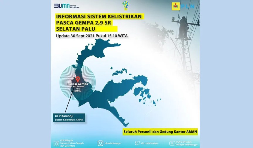 Info update pada pukul 15.10 WITA untuk semua sistem kelistrikan dipastikan aman di seluruh unit yang berada dibawah PLN Unit Pelaksana Pelayanan Pelanggan Palu, serta seluruh personil dan aset PLN juga dipastikan aman.