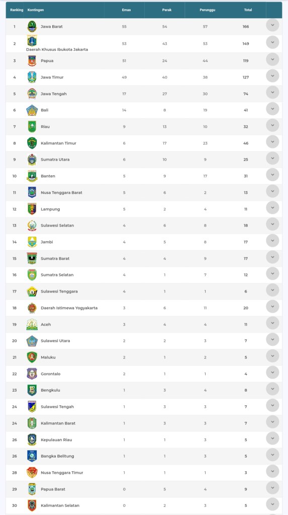 Jayapura Papua – Perolehan sementara medali PON XX Papua 2021 hingga Kamis (7/10/2021), pukul 21.00 WIT, menampilkan Jawa Barat di posisi pertama dengan mengumpulkan sebanyak 166 medali, terdiri dari 55 emas, 54 perak, dan 57 perunggu.