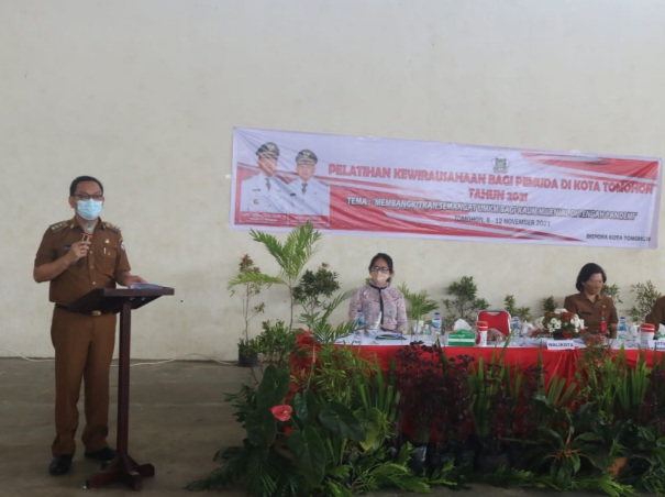 Tomohon – Pemerintah Kota Tomohon melalui Dinas Kepemudaan dan Olahraga Daerah menggelar kegiatan pelatihan kewirausahaan bagi pemuda di Kota Tomohon dengan tema “membangkitkan semangat UMKM bagi kaum milenial ditengah pandemi”. Kegiatan dilaksanakan di GOR Babe Palar Tomohon, senin (8/11/21).