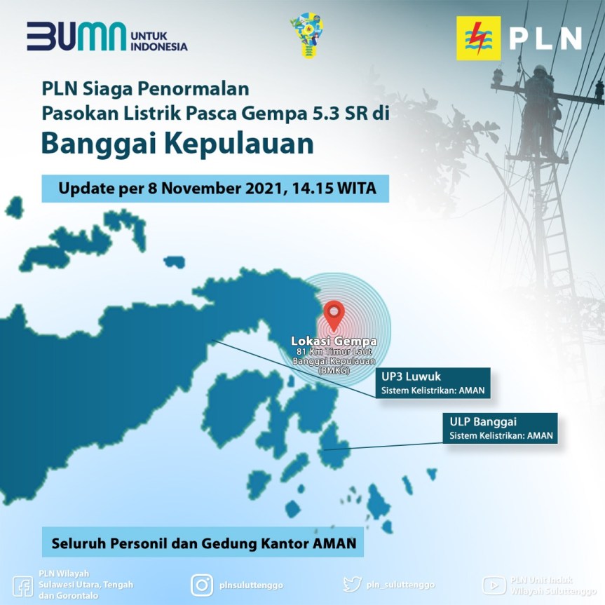 Agus Tasya selaku Manager Unit Pelaksana Pelayanan Pelanggan Luwuk menjelaskan bahwa sistem kelistrikan pada Unit Layanan Pelanggan Banggai yang merupakan wilayah kerja terdekat dengan lokasi gempa kondisi kelistrikan aman.