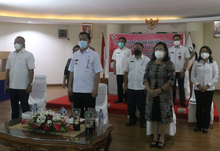 Penghargaan diterima Wali Kota dan Wakil Qali Kota secara daring, yang dilaksanakan di Mall Pelayanan Publik Wale Kabasaran Tomohon, Rabu (17/11/21).