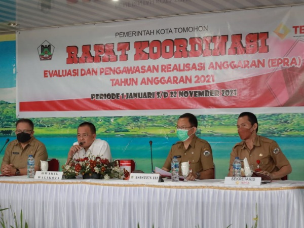 Tomohon – Rapat Koordinasi EPRA Evaluasi dan Pengawasan Realisasi Anggaran (EPRA) Pemerintah Kota Tomohon Periode 1 Januari s/d 22 November Tahun Anggaran 2021, dilaksanakan di Rumah Dinas Walikota, Selasa (23/11/21).