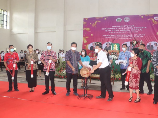 Tomohon – Wali Kota Tomohon Caroll Senduk SH hadir mendampingi Wakil Gubernur Sulut Steven Kandouw dalam ibadah syukur Kerukunan Keluarga Pendeta dan Guru Agama (KKPGA) rayon Tomohon 2022 yang dilaksanakan di GOR Babe Palar Tomohon, Kamis (17/2/22).