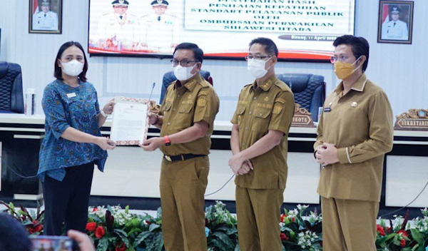 Bitung – Wali Kota Bitung Maurits Mantiri, MM, didampingi Wakil Wali Kota Bitung Hengky Honandar, SE serta Sekda Kota Bitung Dr. Audy Pangemanan menerima hasil penilaian kepatuhan standard pelayanan publik pemerintah Kota Bitung tahun 2021 yang diserahkan oleh Kepala perwakilan Ombudsman RI Provinsi Sulut Ibu Meilani Limpar, SH, Senin (11/4)