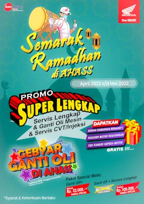 Dengan servis menggunakan promo Super Lengkap yakni servis lengkap, ganti oli mesin dan servis CVT / injeksi, konsumen bisa mendapatkan Hadiah Ramadhan, Voucher Motor Kesayangan dan Cek kondisi Sepeda Motor Gratis.