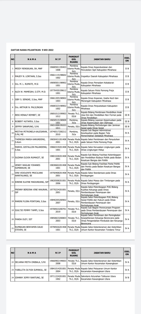 Dalam pelantikan, Kadis Kependudukan dan Catatan Sipil dijabat oleh Meidy Rengkuan, SH, MAP, Moudy Lontaan, S.Sos yang sebelumnya menjabat Kadis Koperasi dan UMKM kali ini di percayakan sebagai Inspektur, Drs. Luvi Rumate, MSi dilantik sebagai Kadis Pemadam Kebakaran, Alex Mamesah, SSTP, MSi sebagai Kasat Pol PP, Siby Sengke, S. Sos, MAP sebagai Kadis Koperasi dan UMKM serta Drs. Arthur Palilingan sebagai Kadis Perpustakaan.