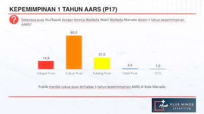 Rinciannya, 14,9 persen publik merasa sangat puas dan 60,2 persen publik cukup puas. Sedangkan untuk publik yang merasa kurang puas terhadap kinerja Walikota – Wakil Walikota Manado ada 21,5 persen, sementara 2,4 persen tidak puas, dan tidak tahu/tidak menjawab 1,0 persen.