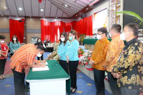 SULUTNEWSTV.com, MANADO – Pemerintah Kota Manado secara gotong royong melakukan pencegehan stunting di Kota Manado. Hal itu ditandai dengan kegiatan Penandatanganan Nota Kesepahaman (MoU) antara Ketua TP-PKK Kota Manado Ny Irene Angouw Pinontoan dengan Kepala Perangkat Daerah, yang disaksikan langsung oleh Wali Kota Manado Andrei Angouw dan Wakil Wali Kota Manado dr Richard Sualang, di Ruang serbaguna, Kamis(18/8/2022).