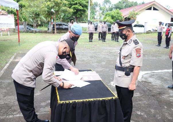 Kapolres sebagai inspektur upacara dalam sambutannya menyampaikan ungkapan syukur kepada Yang Maha Besar Tuhan, atas berkatNya sehingga pelantikan boleh terlaksana.