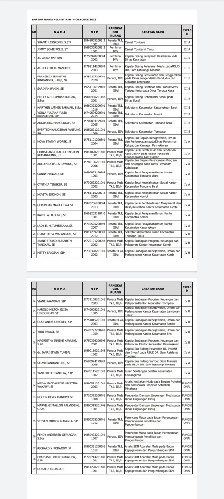 Dalam pelantikan ini, Shanti Lengkong, SSTP yang sebelumnya menjabat Sekretaris Kecamatan Tondano Barat, kali ini dipercayakan menjadi Camat Tombulu dan Jimmy Polii, ST menjabat Camat Tombariri Timur.