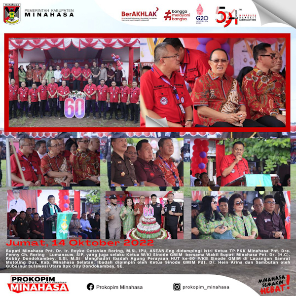 MINAHASA – Bupati Minahasa Dr. Ir. Royke O,Roring M,Si (ROR) didampingi Ketua TP-PKK Minahasa Dra.Fenny Roring-Lumanauw SIP bersama Wakil Bupati Minahasa Robby Dondokambey S,Si menghadiri Ibadah Agung Perayaan HUT ke-60 Pria /Kaum Bapa Sinode GMIM di Lapangan Sam Ratulangi Motoling Dua, Minahasa Selatan, Jumat (14/10/2022) .