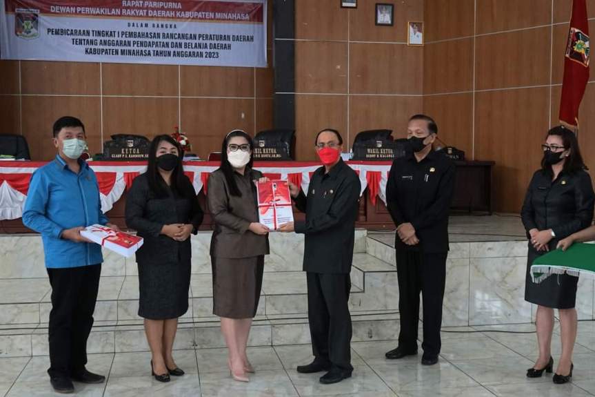 Diakhir rapat paripurna, dilakukan penandatanganan dan penyerahan berkas pembicaraan tingkat satu APBD tahun 2023, yang dilakukan Ketua DPRD Glady Kandouw dan Bupati Royke Roring.