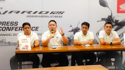 “Jadi sebenarnya, New Honda Vario 125 ini sudah dilaunching AHM September bulan kemarin. Dan hari ini, kami coba perkenalkan ke masyarakat Sulut lewat rangkaian kegiatan di Atrium Megamall, hari ini,” kata Marketing Division Head DAW Jemmy Febrianto dalam pressconference di MM Juice Kawasan Megamas Manado, Minggu(4/12/2022).