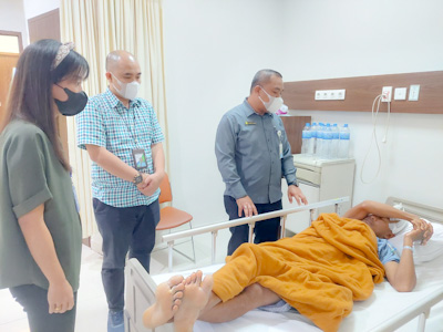 Kepala Kantor Cabang BPJS Ketenagakerjaan Sulawesi Utara Sunardy Syahid didampingi Kepala Bidang Pelayanan Rezky Andre Ratu melakukan kunjungan kepada salah satu Pekerja Jasa Konstruksi yang mengalami musibah kecelakaan kerja yang sementara dirawat di Rumah Sakit Siloam Manado, Selasa (3/1/2023).