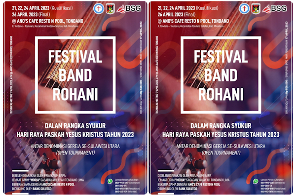Tondano – Dalam rangka Syukur Hari Raya Paskah Yesus Kristus Tahun 2023, pada bulan April mendatang, Festival Band Rohani akan di gelar di Kota Tondano.