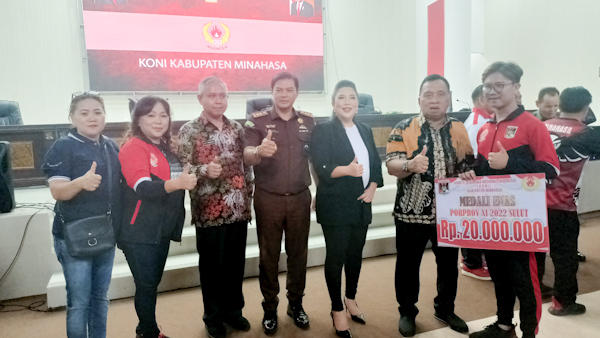 MINAHASA – Ketua Dewan Perwakilan Rakyat Daerah (DPRD) Kabupaten Minahasa yang juga sebagai Ketua Komite Olahraga Nasional Indonesia (KONI) Kabupaten Minahasa Glady Kandouw, SE menyerahkan bonus untuk para atlet yang berhasil meraih medali pada Pekan Olahraga Provinsi (Porprov) XI Bolmong 2022, di Kantor DPRD Minahasa, Kamis (30/3/23).