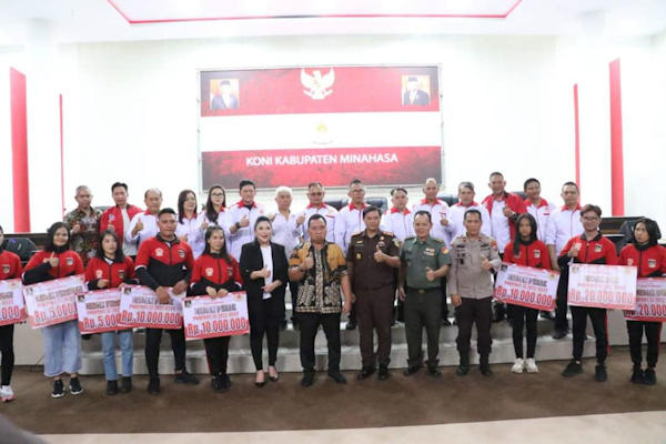 MINAHASA – Ketua Dewan Perwakilan Rakyat Daerah (DPRD) Kabupaten Minahasa yang juga sebagai Ketua Komite Olahraga Nasional Indonesia (KONI) Kabupaten Minahasa Glady Kandouw, SE menyerahkan bonus untuk para atlet yang berhasil meraih medali pada Pekan Olahraga Provinsi (Porprov) XI Bolmong 2022, di Kantor DPRD Minahasa, Kamis (30/3/23).