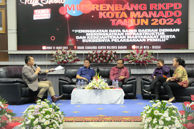 Talk show yang dipandu oleh Moderator Stafsus Wali Kota Manado Felix Palenewen ini bertajuk ‘Peningkatan Daya Saing Daerah Dengan Meningkatkan Infrastruktur dan Kesejahteraan Masyarakat serta Suksesnya Pelaksanaan Pemilu’.