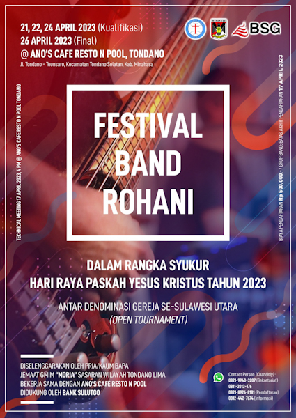 Untuk pendaftaran Festival Band Rohani ini sudah di buka dari tanggal 20 Maret sampai 17 April 2023, dengan biaya 500 ribu per peserta. Rapat teknis pada 17 April di Anos Cafe Tondano, Jl. Tonsaru-Tondano Kecamatan Tondano Selatan.