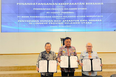 Gubernur Olly Dondokambey, Selasa (4/4/2023) bersama Direktur Utama PT Taspen A.N.S. Kosasih dan Dirut Bank SulutGo Revino Pepah telah melakukan penandatanganan kesepakatan bersama penyediaan hunian untuk ASN.