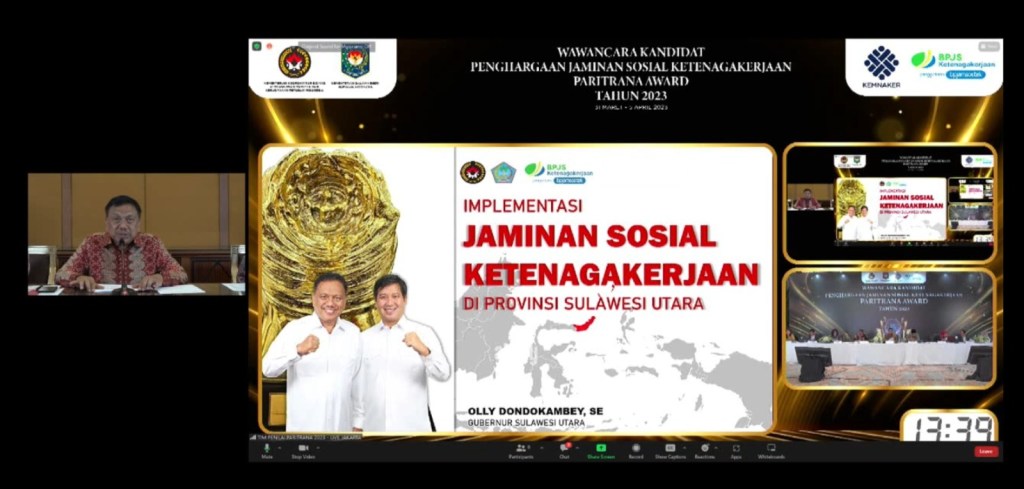 SULUTNEWSTV.com, MANADO – Pemerintah Provinsi Sulawesi Utara dan Pemerintah Kota Manado mengikuti wawancara untuk nominasi penghargaan Jaminan Sosial Ketenagakerjaan paritrana award tahun 2022, di Jakarta (3/4/2023).